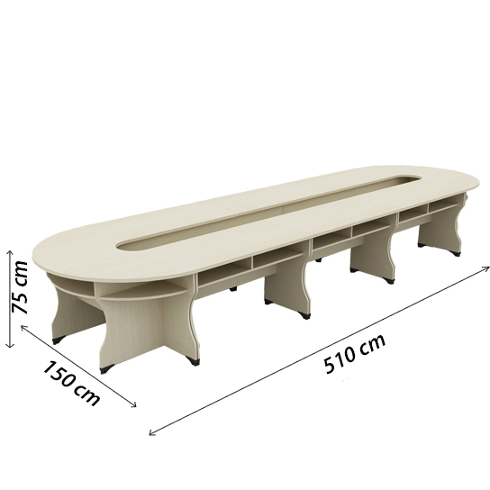 Bàn họp ATH5115 Hòa Phát có kích thước tương đối lớn phù hợp với những không gian văn phòng gồm nhiều thành viên trong một cuộc họp. Bàn có thiết kế hình oval rỗng ở giữa bàn để đi dây điện cáp mạng phục vụ cuộc họp. Dưới mặt bàn chia nhiều ngăn nhỏ đề hồ sơ tài liệu hoặc túi cá nhân rất tiện lợi gọn gàng
