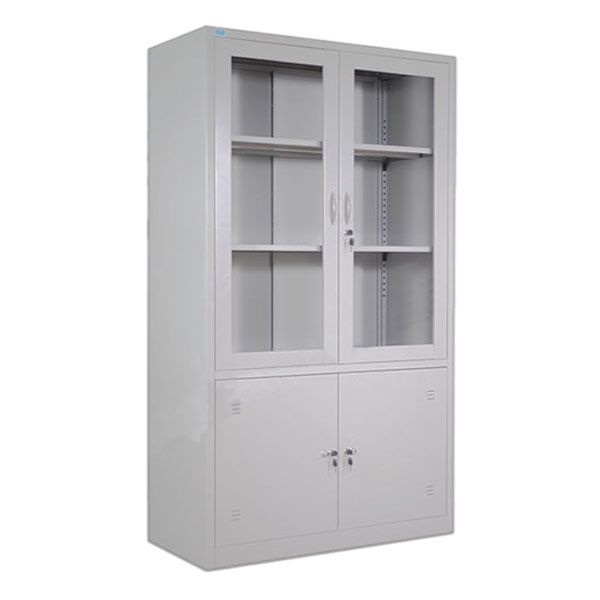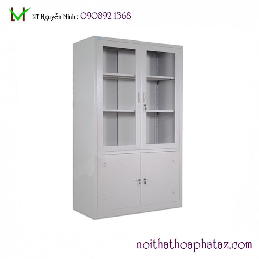 Phần trên gồm 2 cánh mở kính khung sắt, có khóa, bên trong có 2 đợt tủ di động
