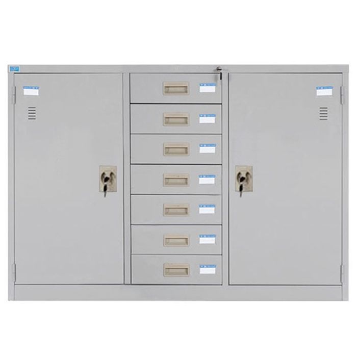 - Tủ sắt sơn tĩnh điện màu ghi, có 1 khối gồm 3 khoang:
