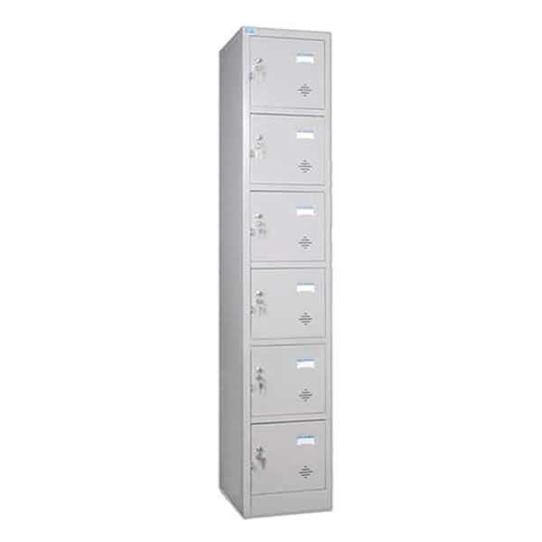 - Tủ sắt sơn tĩnh điện 6 khoang cánh mở , trên mỗi cánh có 1 khóa locker , núm tay nắm và tai khóa móc