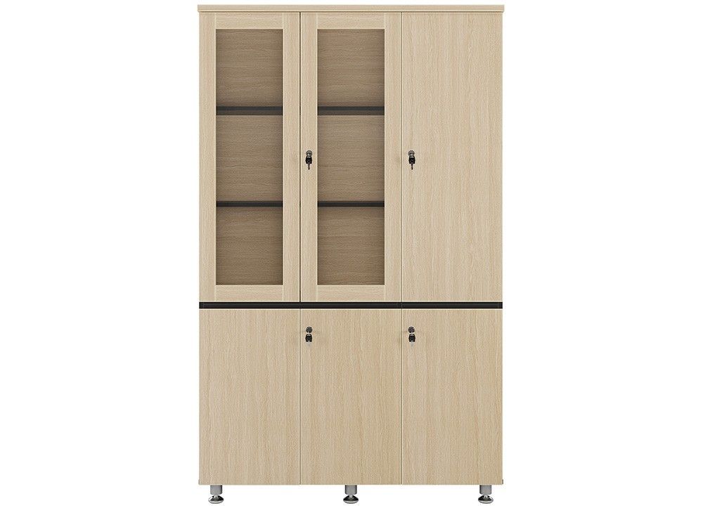 Tủ tài liệu 3 buồng gỗ Melamine, phía trên gồm 2 khoang khung cánh kính để tài liệu, 1 khoang cánh gỗ có suốt treo áo, phía dưới có 3 cánh mở.